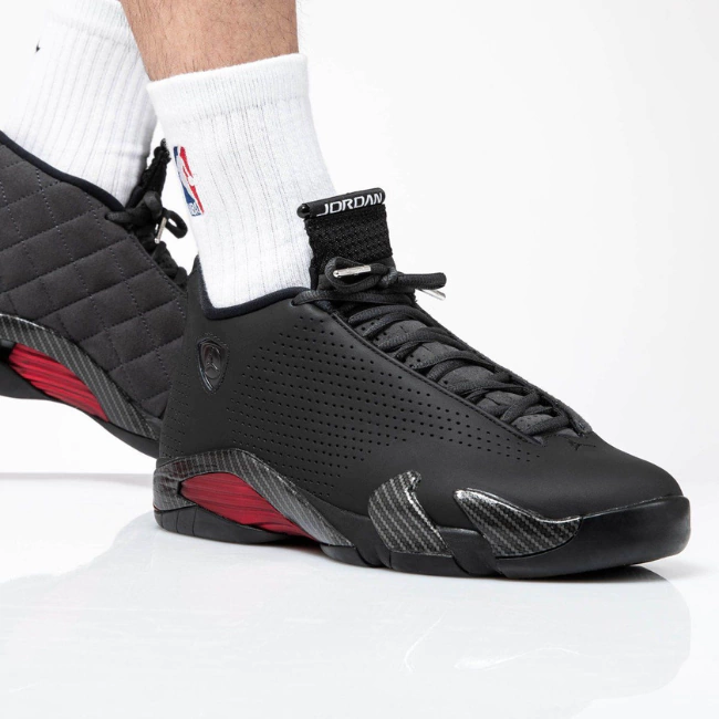O Nike Air Jordan 14 Retro SE 'Black Ferrari' é uma interpretação elegante da inspiração original da silhueta de um carro esportivo italiano. Emitido em dezembro de 2019, o tênis assume um design dividido com couro perfurado na lateral e camurça cinza acolchoada na medial. Um gráfico Jumpman e '23' está gravado no calcanhar. O detalhamento em fibra de carbono envolve a entressola com infusão de ar e a placa cromada vermelha divide a sola de borracha em espinha.