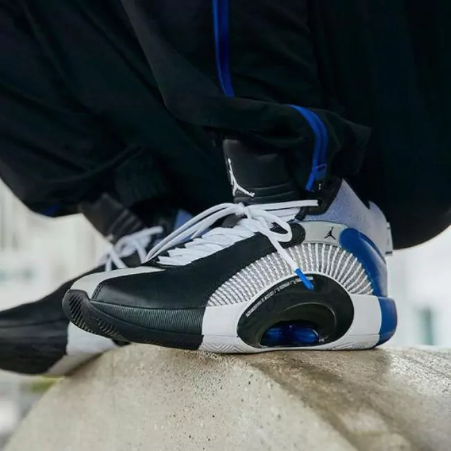 Feito em colaboração com a influente gravadora de Hiroshi Fujiwara, o Fragment Design x Air Jordan 35 'Base Grey' utiliza uma paleta familiar originalmente apresentada no altamente cobiçado Air Jordan 1 de 2014 dos parceiros criativos. O design do calçado é centrado em torno da placa de voo redesenhada, circundado por detalhes Kurim e reforçado com sobreposições de couro em preto e azul royal. A marca tradicional do Jumpman adorna a língua, enquanto uma etiqueta trançada com o logotipo do relâmpago da Fragment se estende para fora do calcanhar.