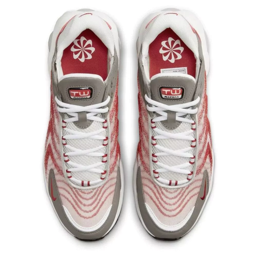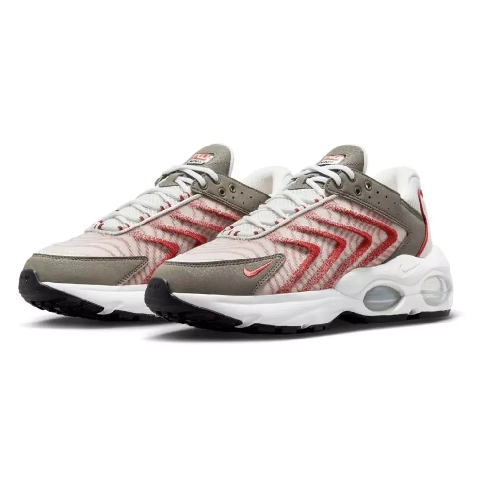 Revestindo seu detalhamento em estilo chevron do painel lateral em uma composição carmesim e branca, outros tons nítidos e incolores reivindicam a língua de malha, os cadarços, a aba do calcanhar e a gola do calcanhar de veludo cotelê. Empregado como um sotaque titular por toda parte, “University Red” alinha os painéis acima mencionados enquanto preenche sua marca bordada “NIKE AIR” e antepé Check em conjunto com seu embelezamento de língua “TW” atualizado. Em outros lugares, a silhueta é adicionalmente iluminada com uma entressola branca folheada e bolhas Air Max azuis geladas antes de sobreposições de couro liso do meio do pé e guarda-lamas com um “Taupe” desbotado em conclusão.
