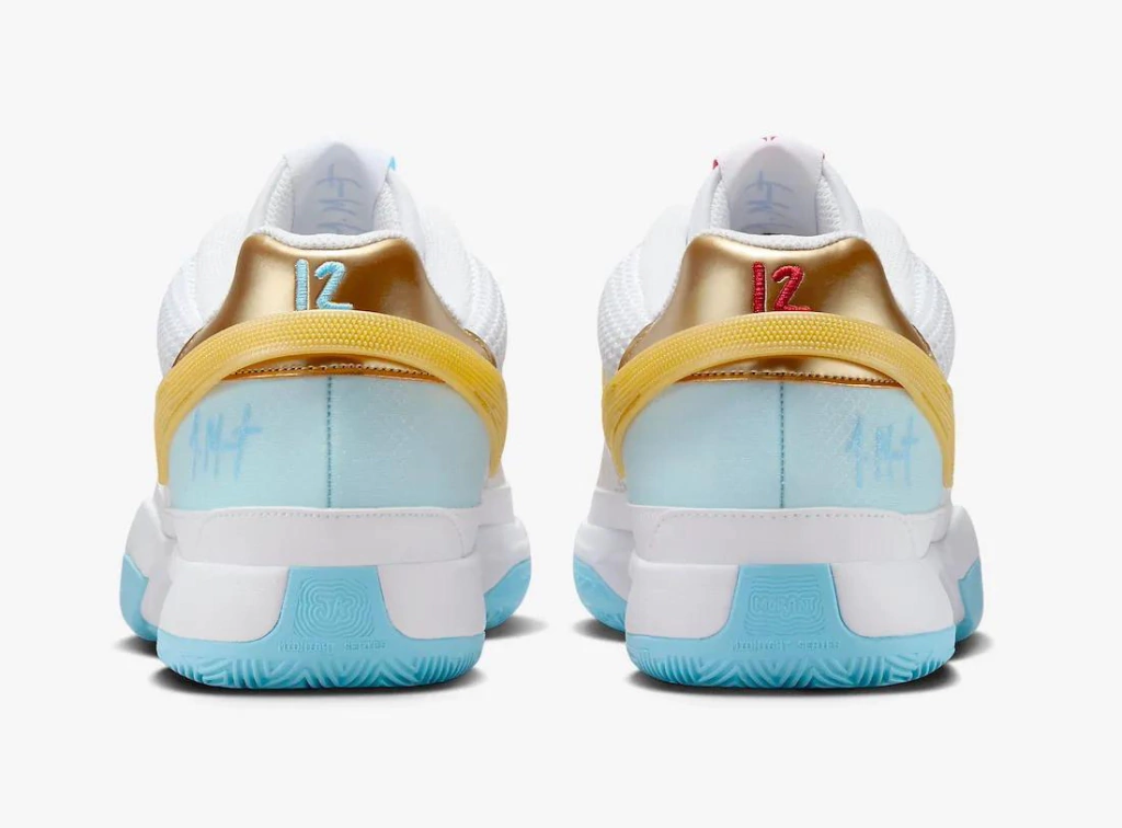 O novo JA 1 "Ano Novo Chinês" em quadra dedica uma maioria dominante da parte superior a uma tonalidade branca nítida em branco que se espalha pela camada de base de malha, sobreposições de couro e construção de língua. Ao lado da entressola e dos cadarços em tons de teal, uma ladainha de detalhes em "Photo Blue" injeta um tratamento azul tonal em toda a aba da língua, na iconografia do calcanhar e na banda de rodagem sob os pés. Além disso, o acabamento de topo baixo é imbuído de um acabamento dourado premium, enquanto os acertos em ouro metálico atestam o swoosh do perfil, a aba do calcanhar, o dubrae de renda infinita e o delicado detalhe floral que consome o painel do antepé.