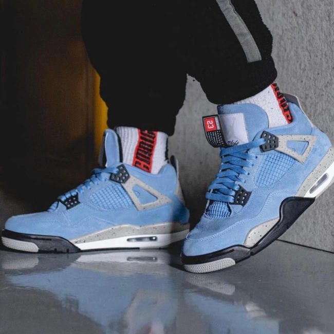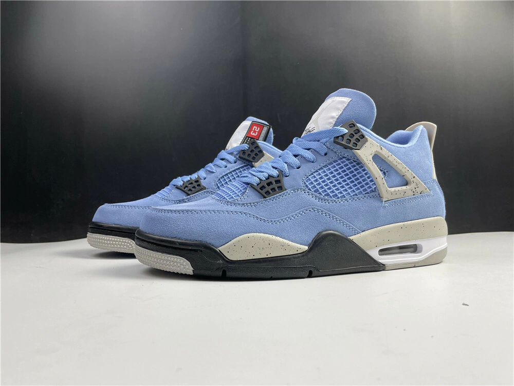 O primeiro Jordan 4 em uma maquiagem "UNC", este design colegial segue os anteriores Air Jordans para empregar o tema popular - o Air Jordan 3 "UNC" e o feminino Air Jordan 1 Mid "UNC" de 2020. A marca Jordan adiciona vários toques de inspiração atlética ao visual, incluindo a adição de uma etiqueta com o nome “removível” à marca de nylon do Jumpman na língua de camurça em referência à etiqueta do produto na parte inferior das camisetas de basquete. A parte superior é construída em camurça University Blue flexível, com exceção da lingueta e do painel intermediário, que apresentam detalhes em malha tonal. Prendedores de renda de plástico preto aparecem na gola e na gola e as abas de plástico “Wings” têm um visual decididamente inspirado no “Cimento”. O clássico detalhamento “Cement” também aparece na parte de trás do sapato com a marca Jumpman preta e no para-lama. Uma pequena unidade de ar visível no calcanhar completa o visual. Data de lançamento: 28 de abril de 2021.