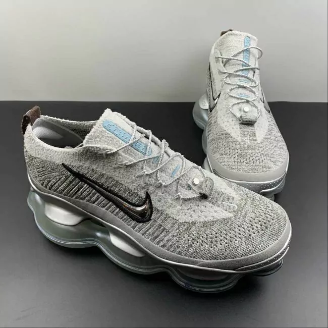 A semelhança com o VAPORMAX é evidente. O cabedal é de FLYKNIT, com um Swoosh costurado no calcanhar e na biqueira, enquanto um inédito NIKE está no puxador traseiro. A oferta de cápsula de AIR é generosa, prometendo “o conforto de amanhã, hoje.