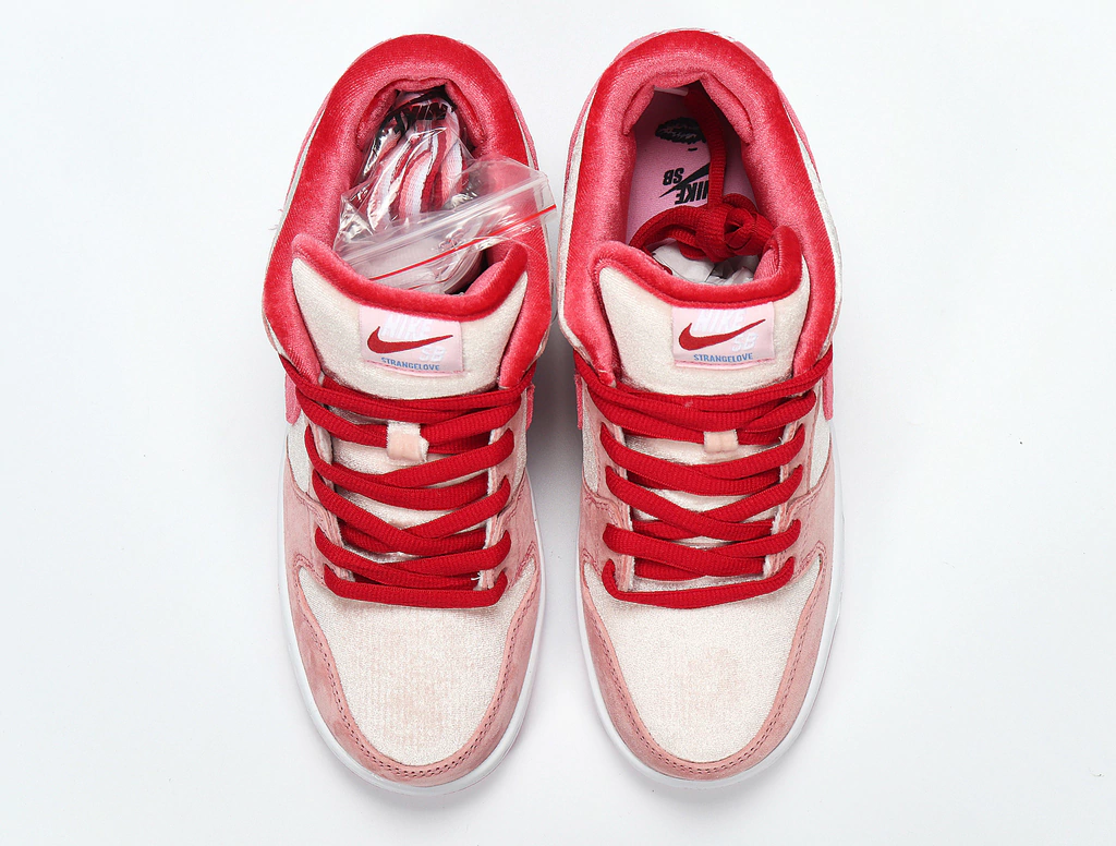 A Nike Skateboarding colaborou com a StrangeLove Skateboard para uma edição especial SB Dunk Low para comemorar o Dia dos Namorados. Ela foi projetada pelo lendário artista Sean Cliver e Todd Bratrud. Possui painéis de camurça e veludo rosa com detalhes em vermelho contrastantes nos cadarços, forro e atacadores. Outros detalhes incluem a marca StrangeLove na língua e palmilhas impressas em gráficos. Uma sola translúcida Pink completa o design.